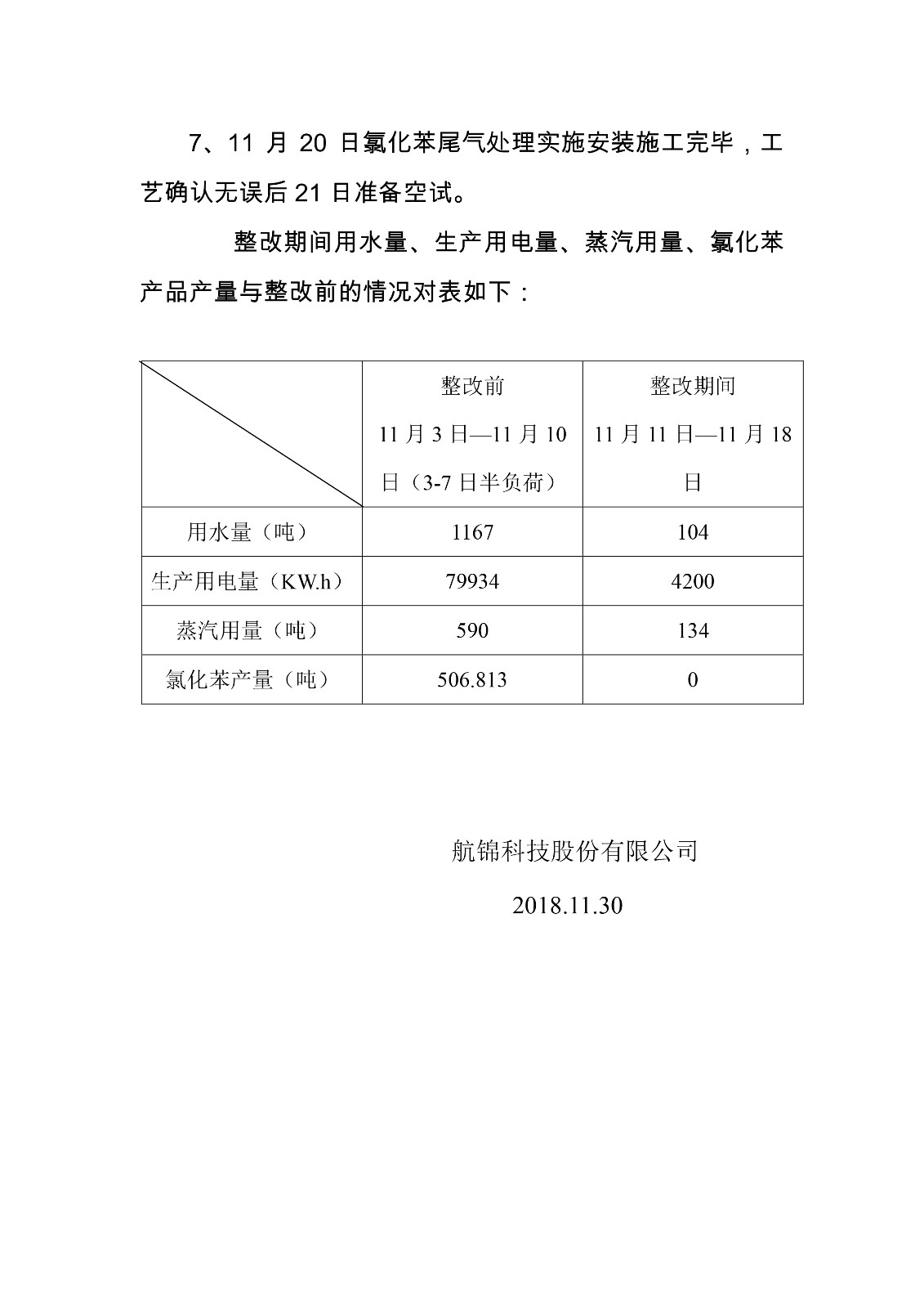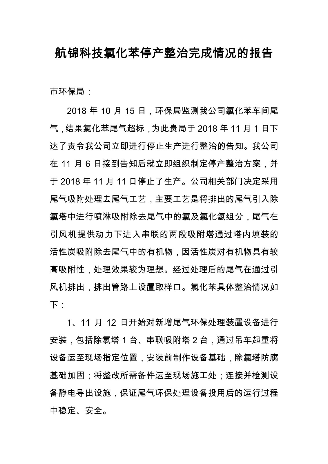 航錦科技股份有限公司氯化苯停產(chǎn)整治完成情況的報(bào)告