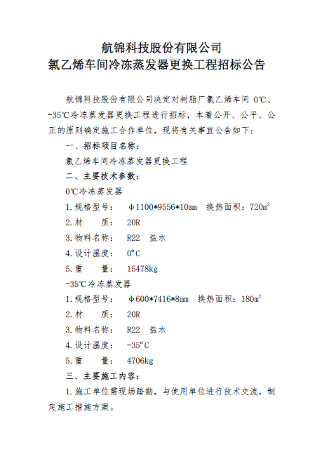 航錦科技股份有限公司氯乙烯車間冷凍蒸發(fā)器更換工程招標(biāo)公告